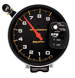 Auto Meter 5 inch (127 millimeter) Tachometer Single Range with Memory, 9,000 RPM, Pedestal Mount, Pro-Comp are mountable in every conceivable position and the versatility and durability of the Pedestal Mount tachs have made them a race proven favorite for over 30 years. These tachs offer a variety of performance oriented options from shift lights to memory recall functions, coupled with a trade marked aluminum and rubber shock strap design for the best vibration protection available. Operates on 4, 6, or 8 cylinder engines with points, electronic, and most 12V high performance racing ignitions. Two-stage shift-lite. Does NOT include red and green bulb covers. See LED replacement bulbs for colored illumination options.