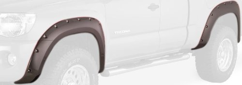 With their recessed stainless steel bolts and massive presence, Pocket Style(R) Fender Flares are a Bushwacker original and an off-road icon. They’re custom-designed for your Toyota Tacoma to complement oversized tires and high-clearance lift kits. You can mount them right out of the box, with their tough, OEM-style matte black finish – they’re UV protected so they won’t chalk. Or, paint them to match or accent the body color, for a factory-custom look. Pocket Style(R) Fender Flares are made in the USA from our thick, warp-resistant Dura-Flex(R) 2000 material, tailor-made for added durability and flexibility on the trail. Despite their hard-core bolt-on styling, Pocket Style(R) Fender Flares install easily, with only minimal drilling required. When you need maximum tire coverage with minimum time and effort, it’s in the pocket. Pocket Style(R) Fender Flares from Bushwacker.